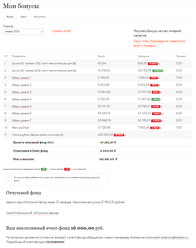 В разделе вы можете посмотреть свои бонусы за интересующий период, скачать отчет. Для статусов СД и выше также предоставлена возможность увидеть динамику показателей относительно прошлого месяца.