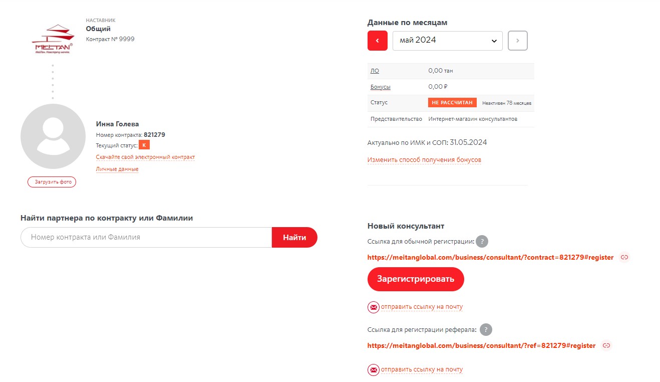 На странице вы сможете скачать ваш электронный контракт, поменять пароль и сделать запрос на смену фамилии, посмотреть данные о личном объёме покупок, рассчитанные бонусы за прошедший месяц, статус (персональный), представительство для получения бонусов.