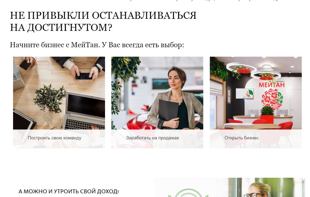 На стартовой странице есть описание различных вариантов начала бизнеса с МейТан: